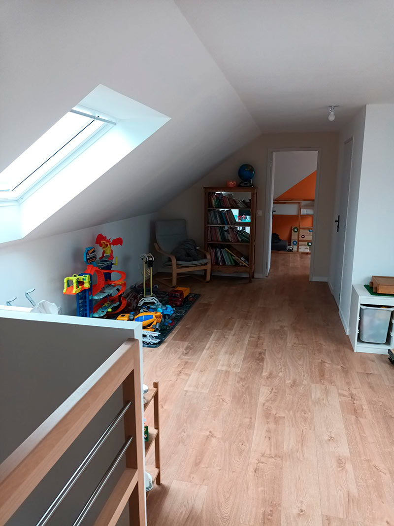 Nos clients ont maintenant un vaste espace de jeu pour leurs enfants, avec en prime un canapé-lit pour accueillir famille et amis. En utilisant efficacement chaque recoin de l’espace disponible, nous avons réussi à récupérer une surface impressionnante de 45.34m2 au sol, dont 17.11m2 habitables, soit 100% de l’espace exploitable au sol.