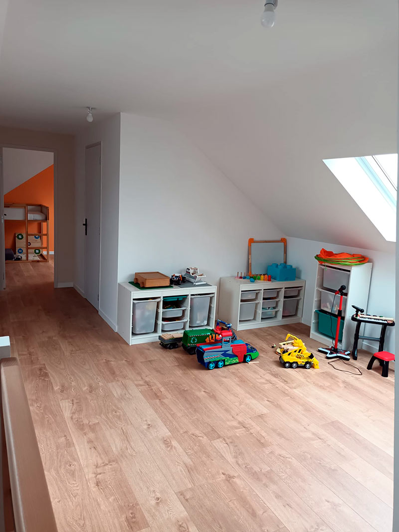 Les jumelles de nos clients adorent cet espace de jeu qui leur est dédié. De plus, nous avons aménagé les sous-pentes pour un rangement sur mesure, permettant ainsi d’optimiser chaque centimètre carré.