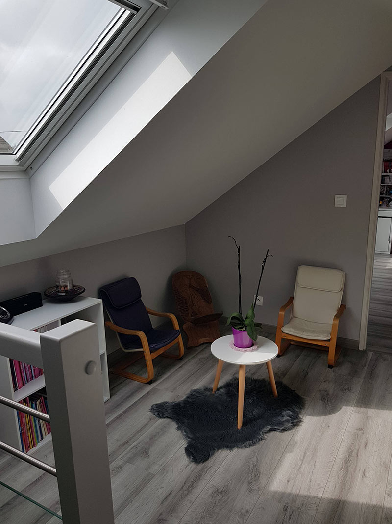 Cette pièce centrale, baignée de lumière naturelle grâce à sa verrière Velux, offre aux enfants un espace où ils peuvent s’amuser et se détendre, tout en servant de zone de transition entre les deux chambres. L’ajout de ces ouvertures a considérablement amélioré l’ambiance, rendant l’étage spacieux, chaleureux et accueillant.